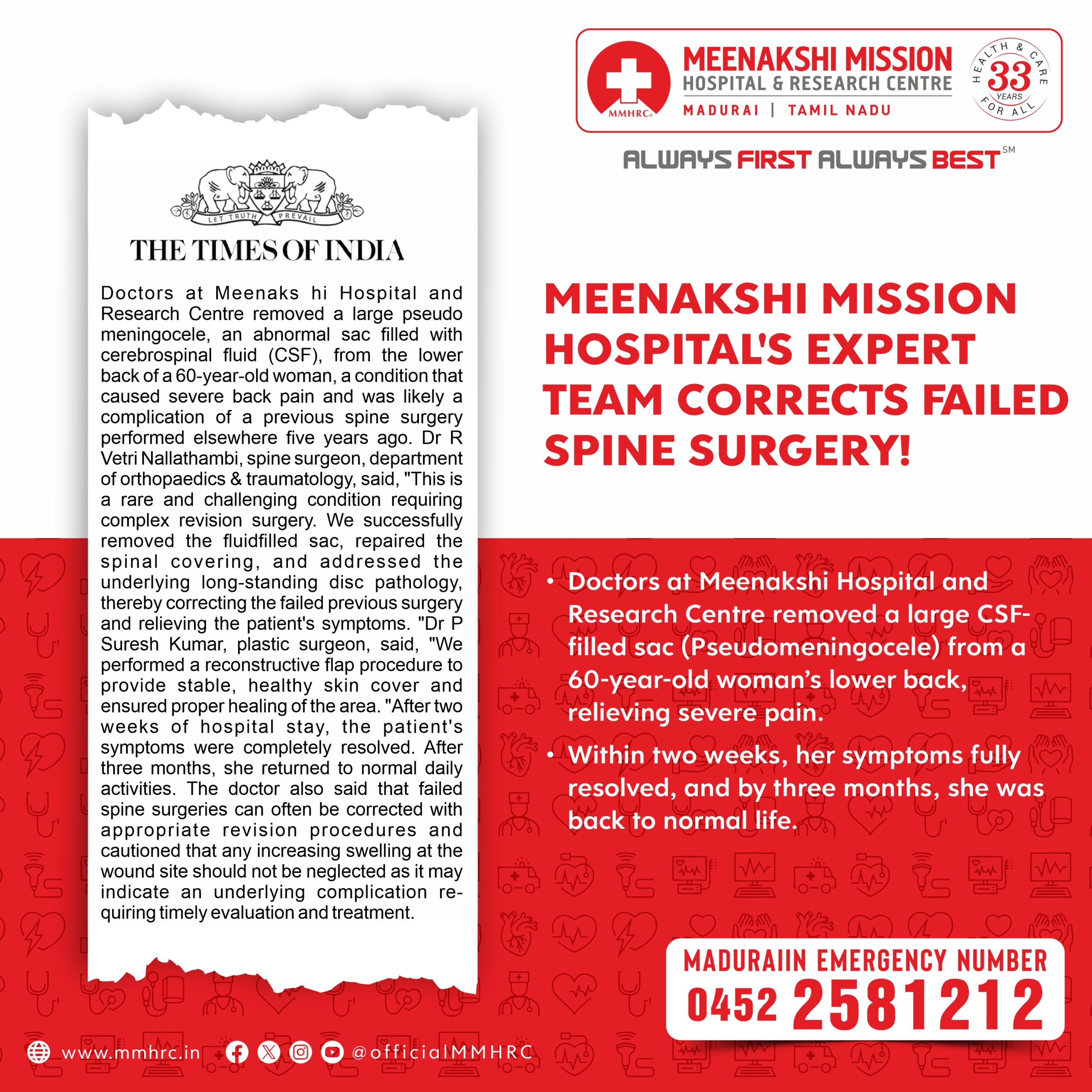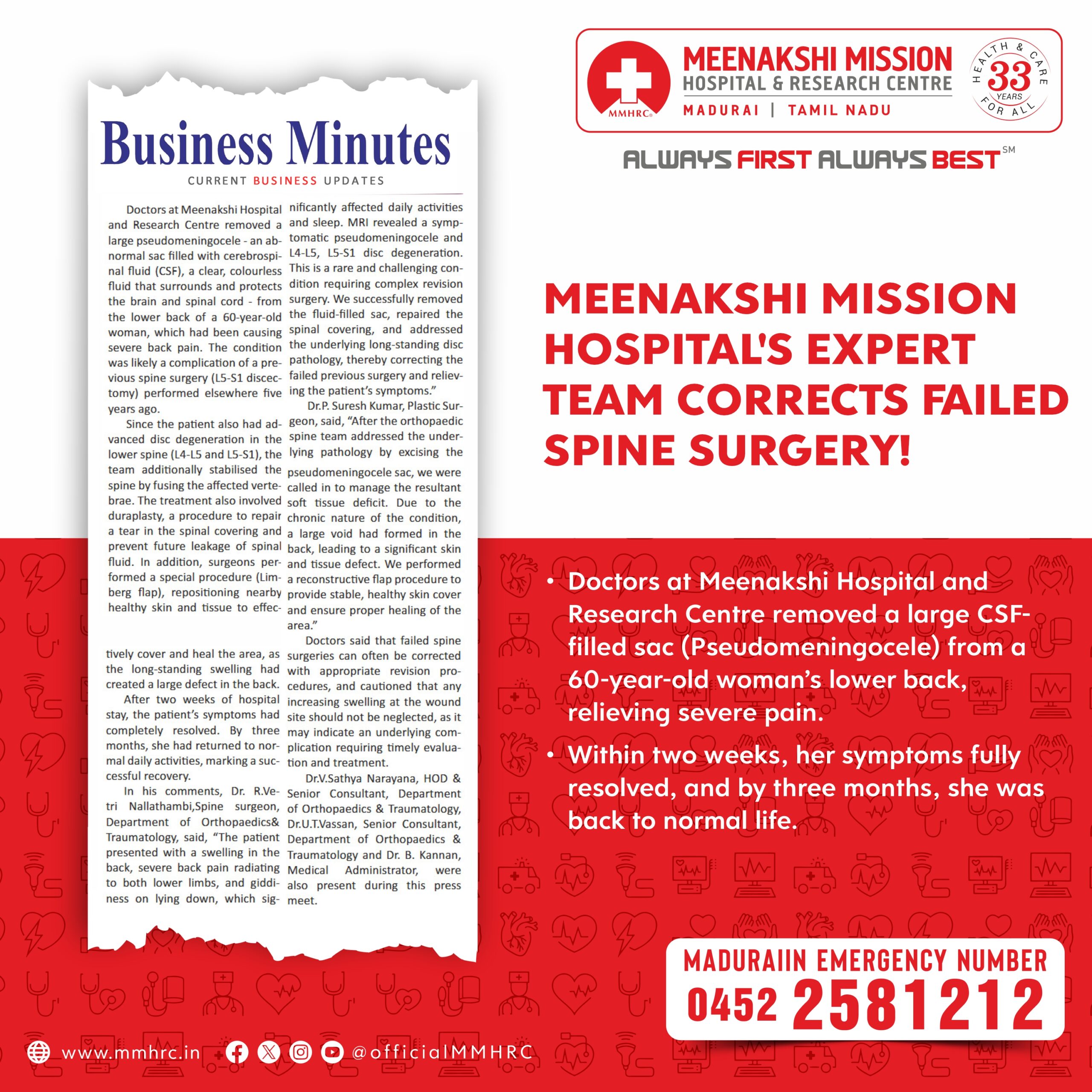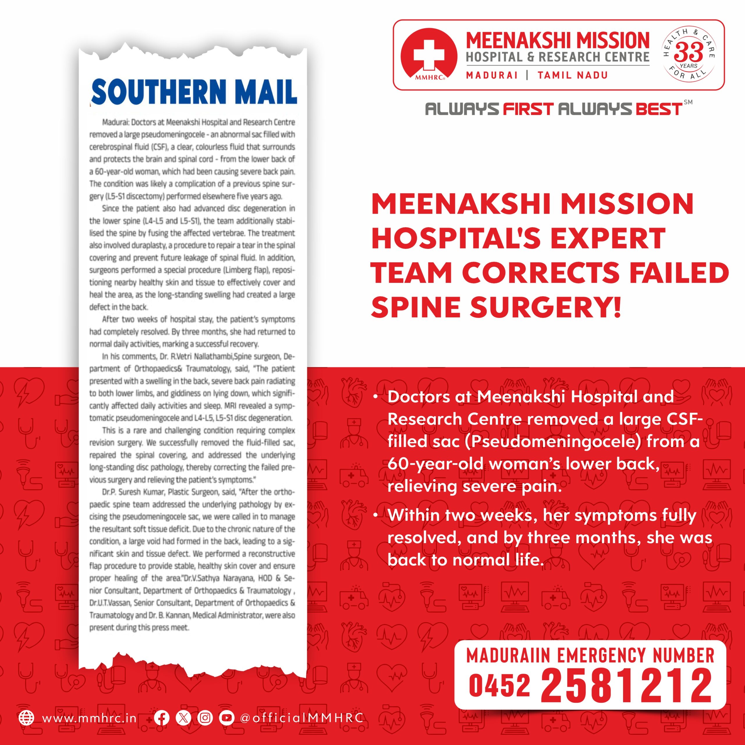 Doctors at Madurai Meenakshi Hospital and Research Centre removed a large CSF-filled sac (pseudomeningocele) from a 60-year-old woman’s lower back, relieving severe pain.
