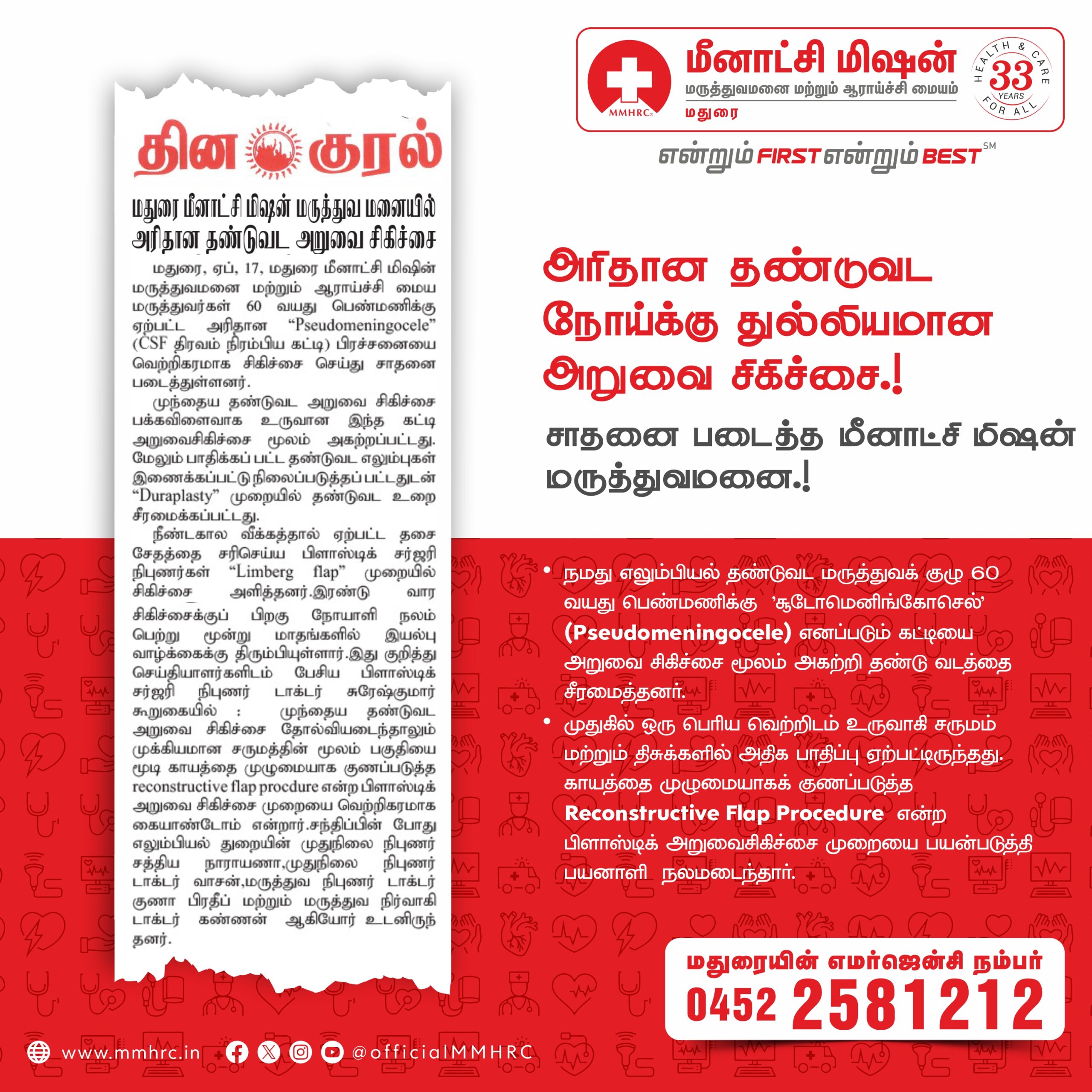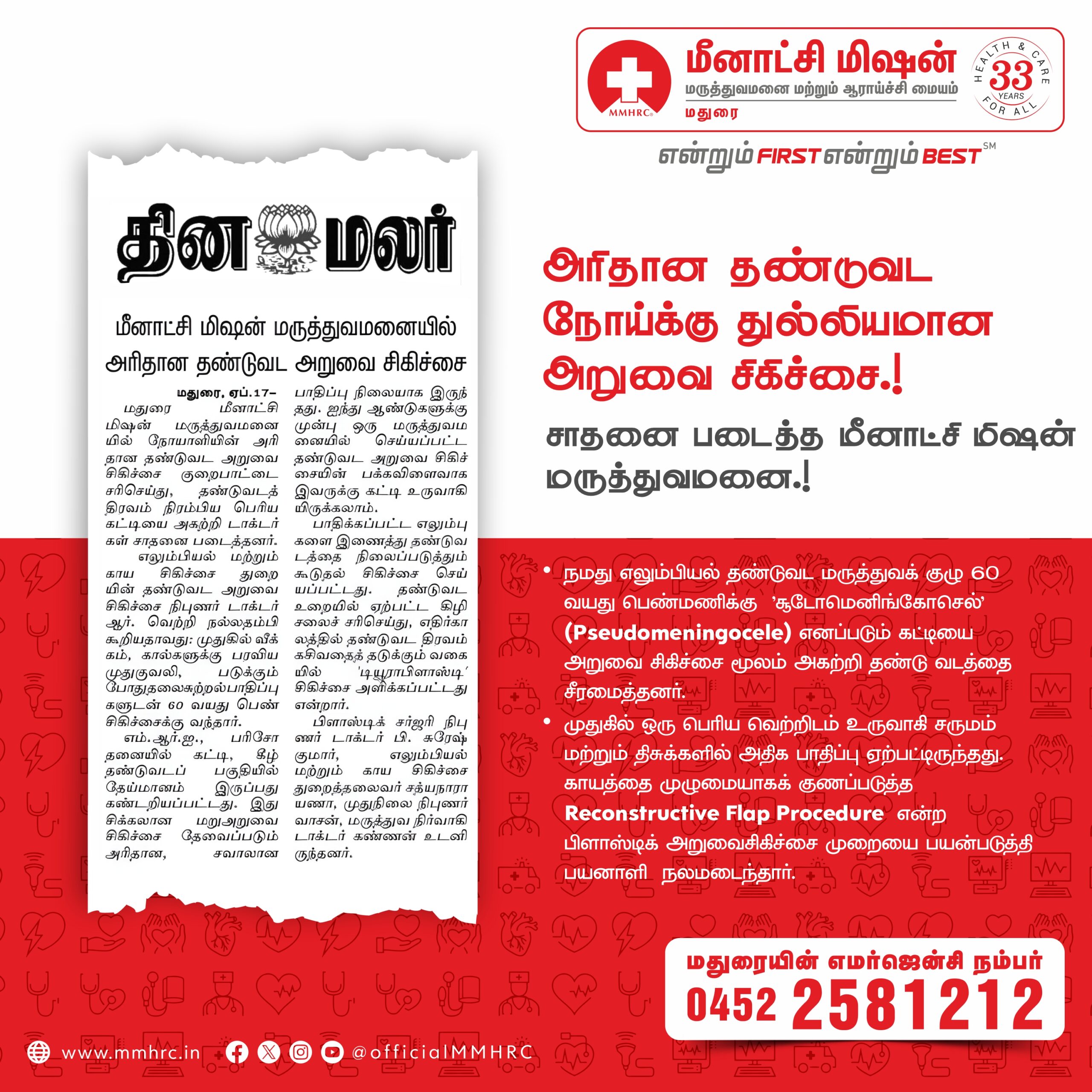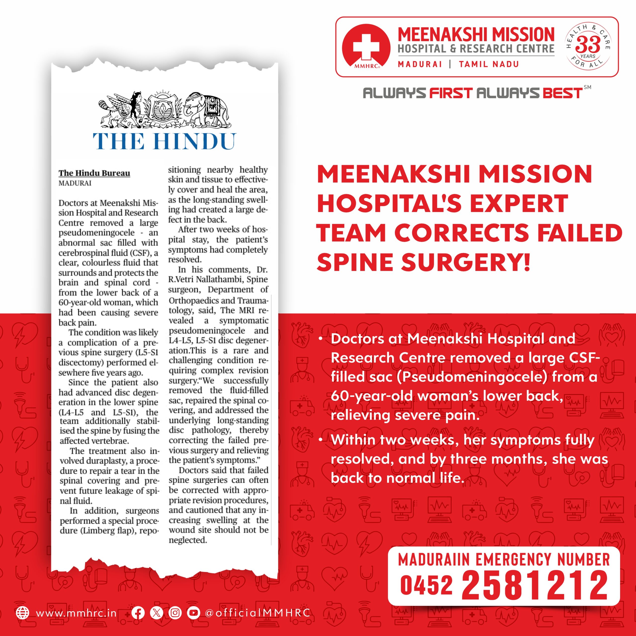 Doctors at Madurai Meenakshi Hospital and Research Centre removed a large CSF-filled sac (pseudomeningocele) from a 60-year-old woman’s lower back, relieving severe pain.