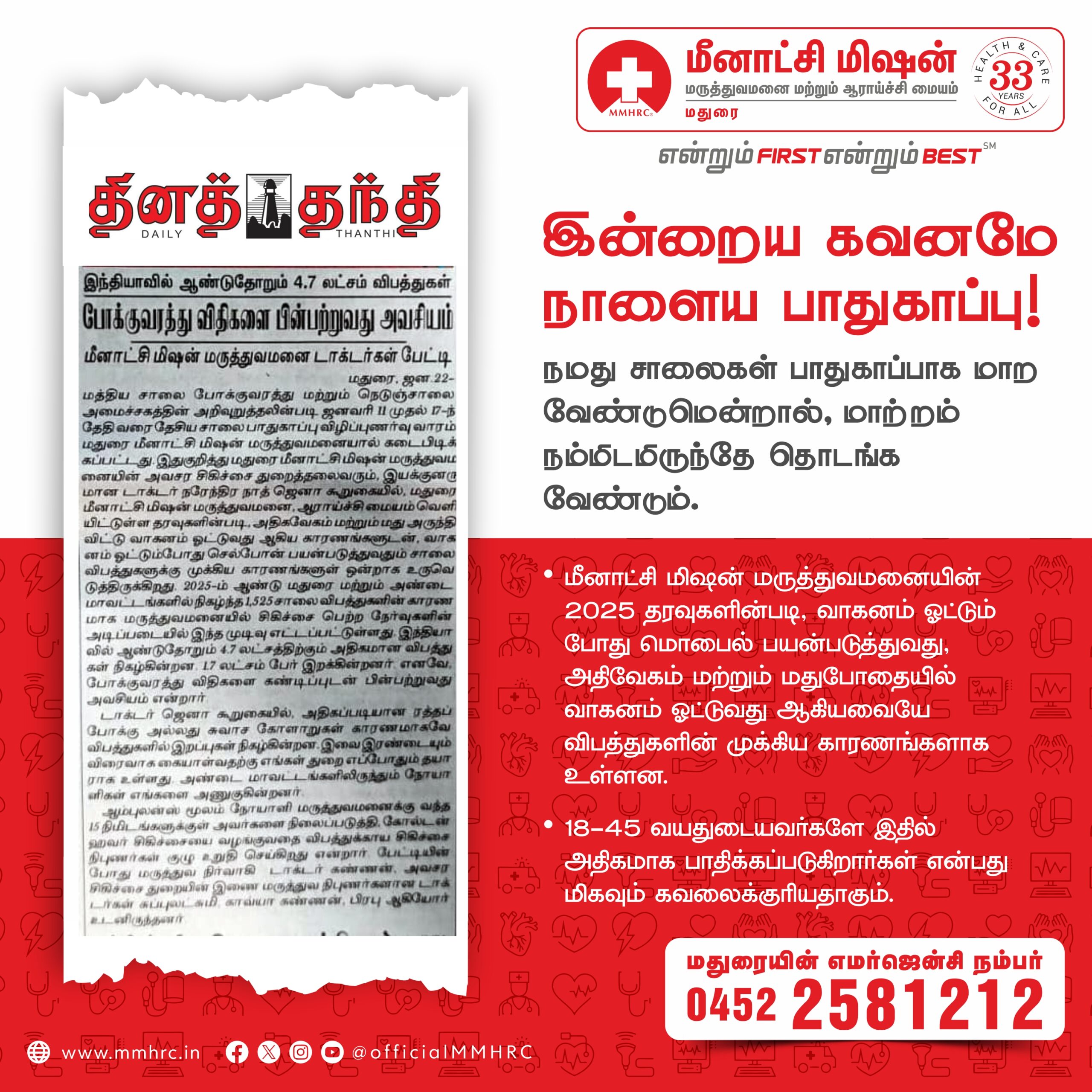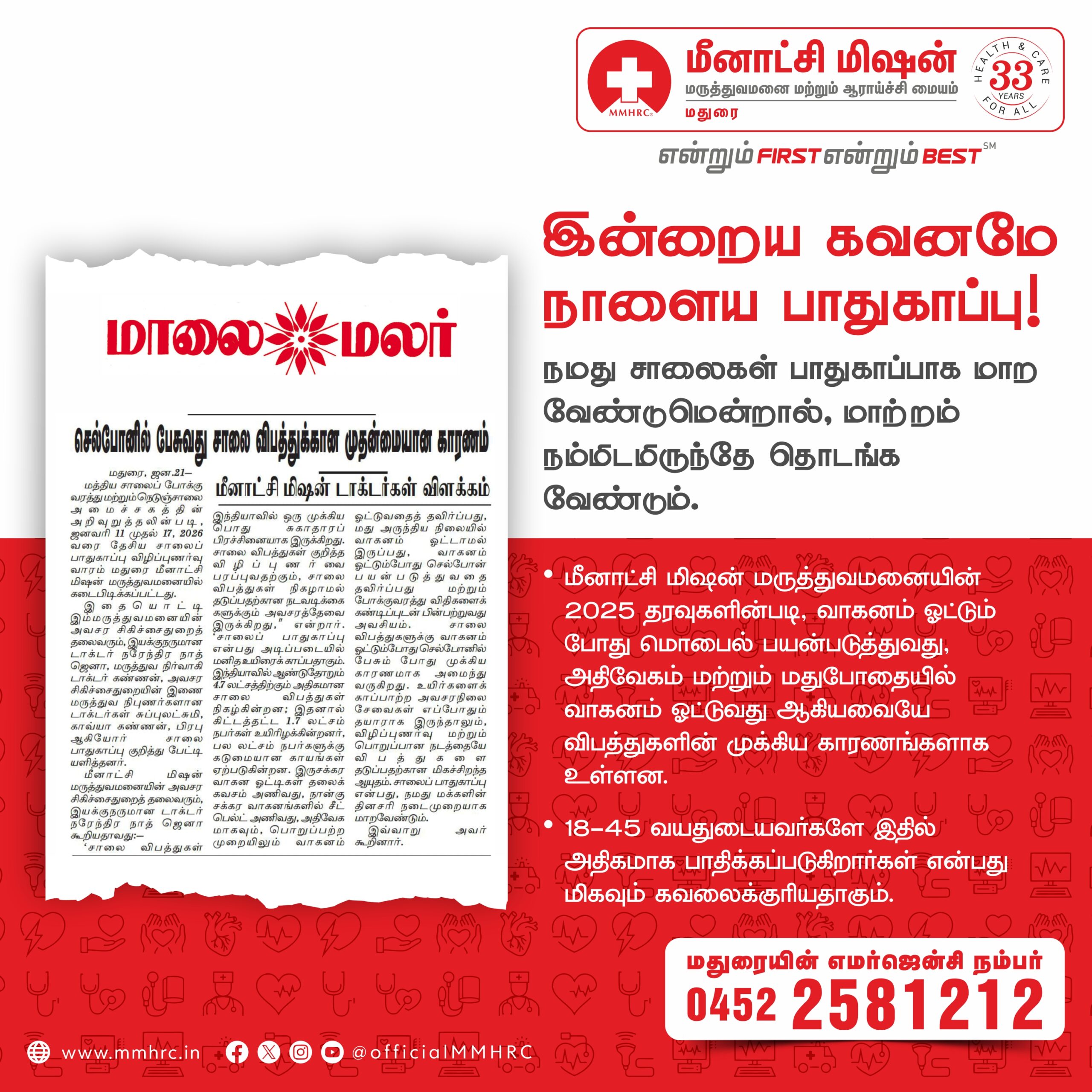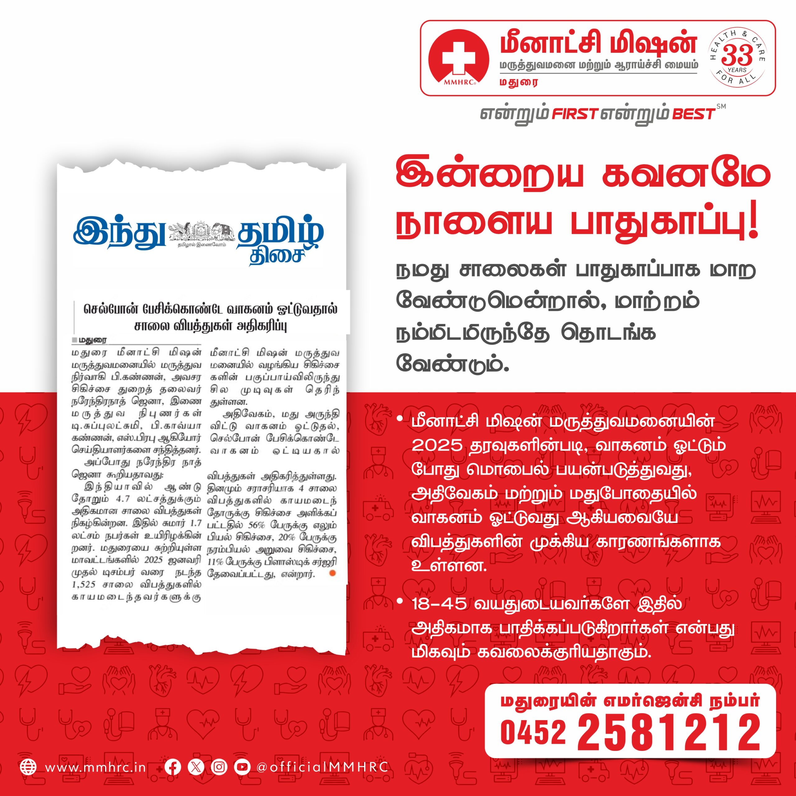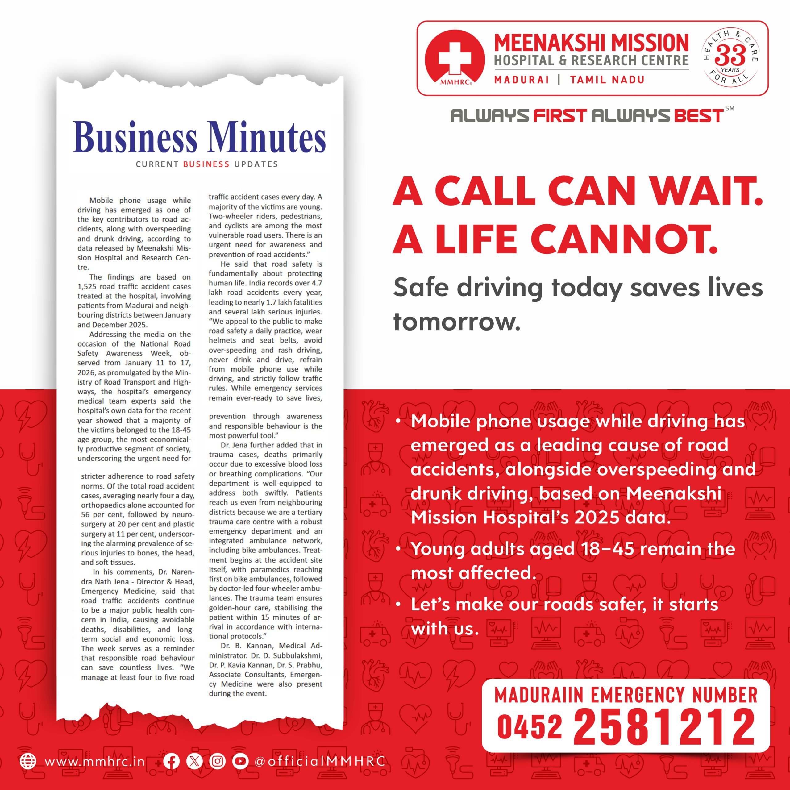 Meenakshi Mission Hospital & Research Centre, Madurai, joins the nation in observing Road Safety Awareness Week from January 11 to 17, 2026, with the theme “Sadak Suraksha, Jeevan Raksha”, highlighting that road safety is fundamentally about protecting human life. Road traffic accidents continue to be a major public health concern in India, causing avoidable deaths, disabilities, and long-term social and economic loss. The week serves as a reminder that responsible road behaviour can save countless lives.