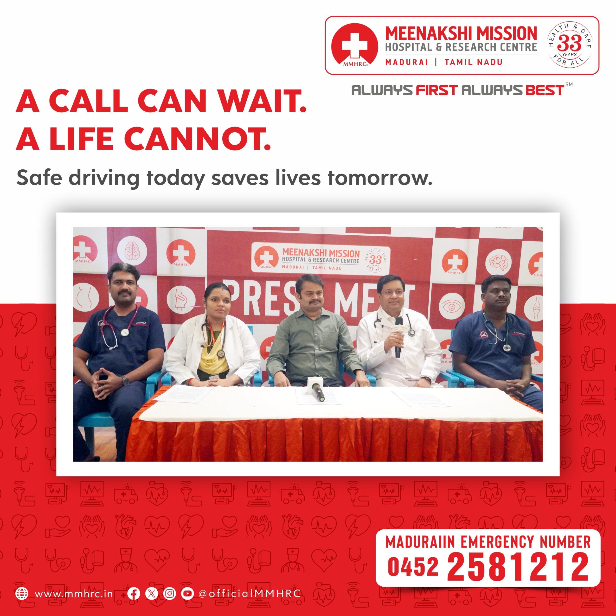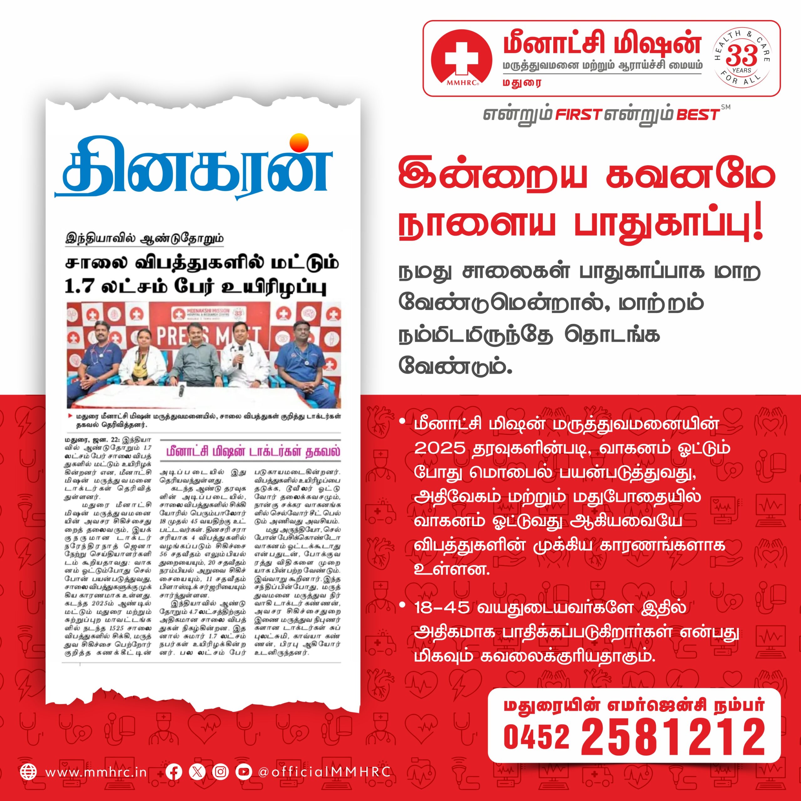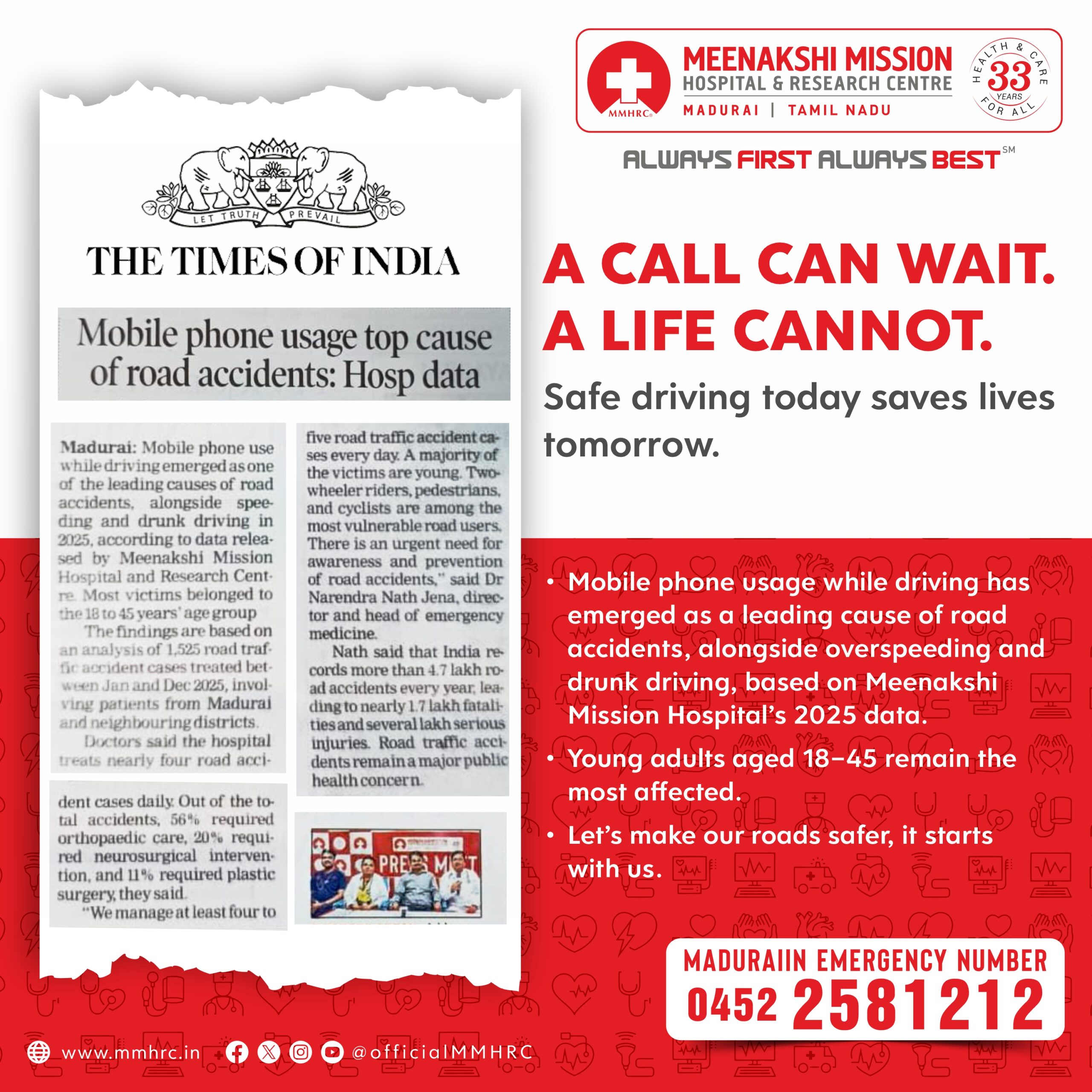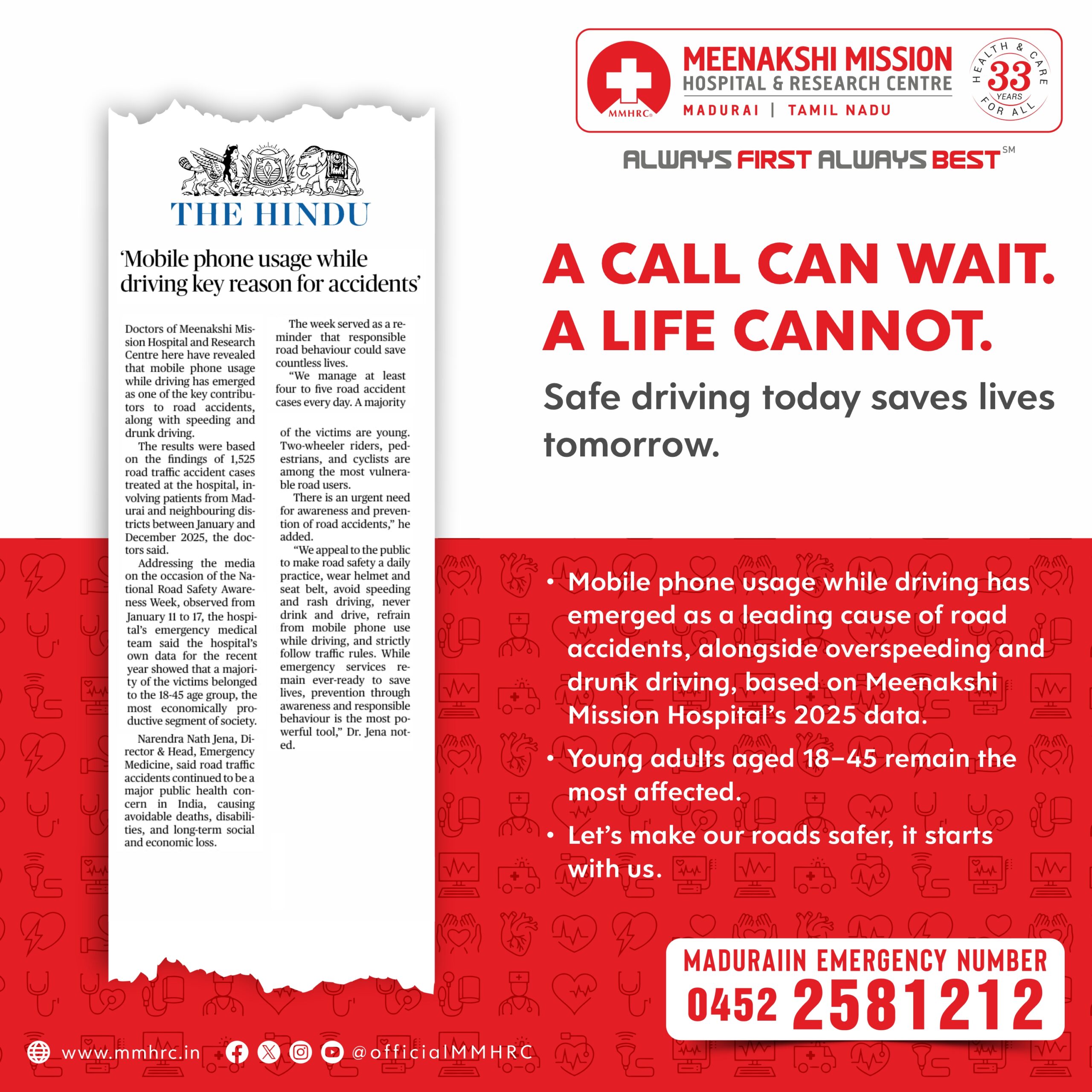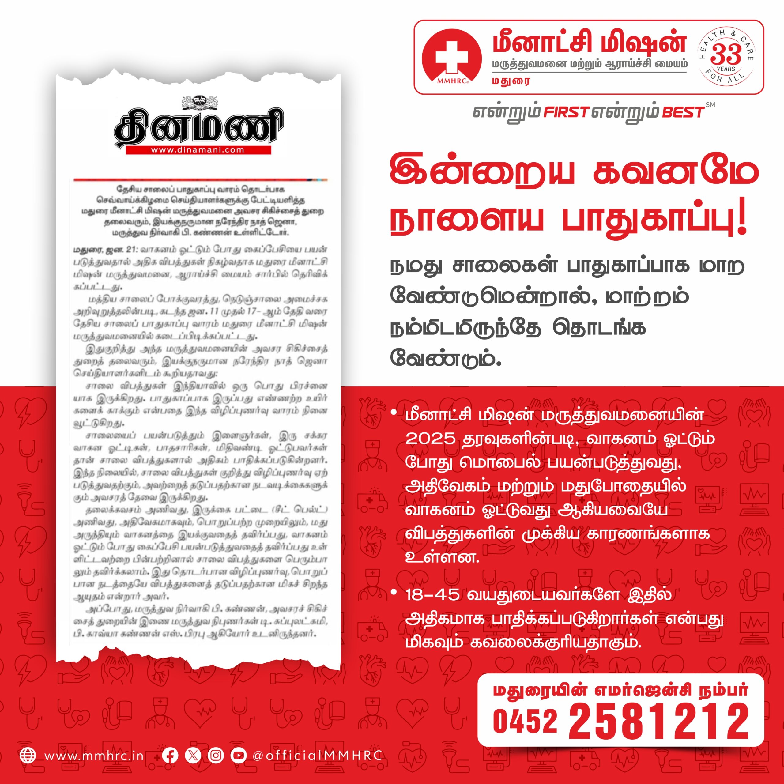 Meenakshi Mission Hospital & Research Centre, Madurai, joins the nation in observing Road Safety Awareness Week from January 11 to 17, 2026, with the theme “Sadak Suraksha, Jeevan Raksha”, highlighting that road safety is fundamentally about protecting human life. Road traffic accidents continue to be a major public health concern in India, causing avoidable deaths, disabilities, and long-term social and economic loss. The week serves as a reminder that responsible road behaviour can save countless lives.